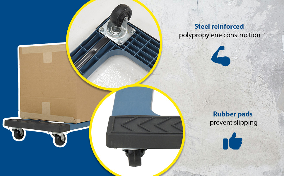 Plastic Dolly with Rubber Ends is steel reinforced high impact polypropylene construction. Nonporous surface doesn't split, break, rust or become weak. Rubber pads on dolly prevent slipping.