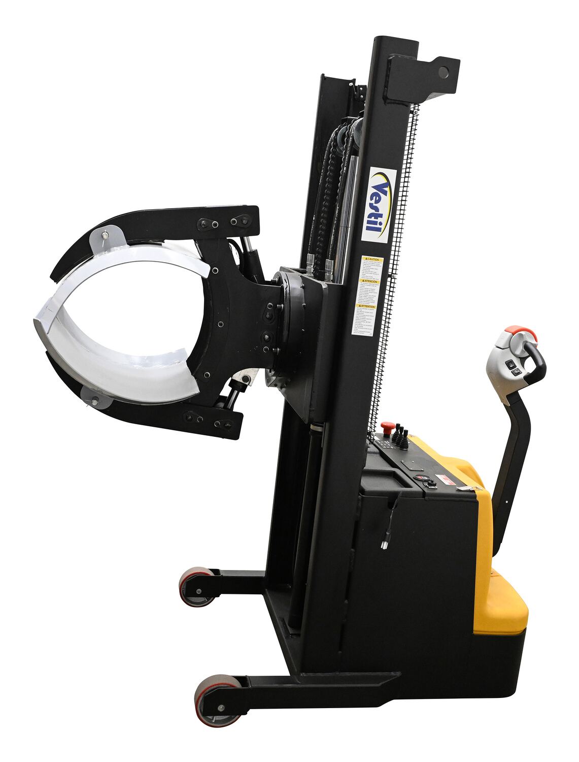 The fully powered vertical drum gripper/rotator is a great asset for the manufacturing and distributing industries. The shortened length allows for use in very tight areas, while the extendable reach helps load and unload places where access is limited, such as pallets and skids. A walk behind design with a max unloaded speed of over 3 mph and a single handle control makes maneuvering into the desired position easy, maximizing efficiency. Long term battery charge allows for constant daily use without needless downtime.