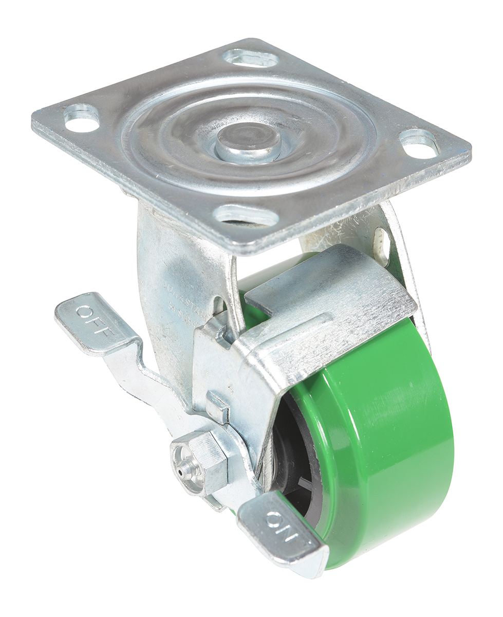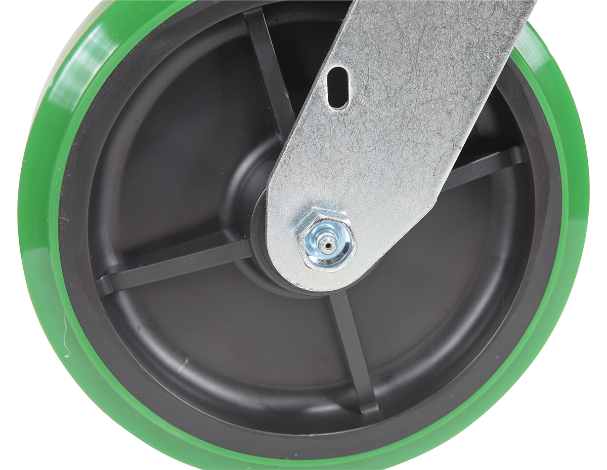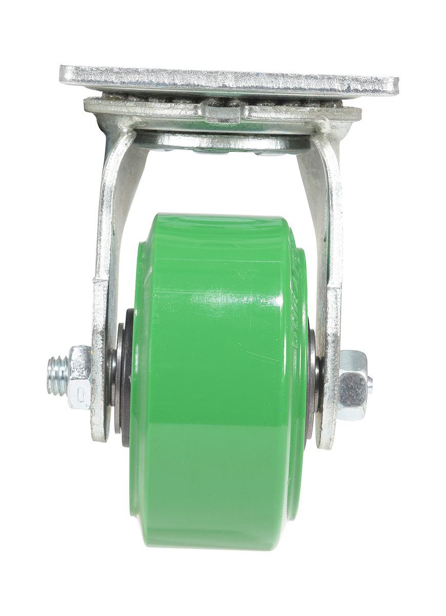 Made with 100% pure polyurethane tread. This caster is a great upgrade for standard polyurethane. Designed using a new liquid cast flow fusion that ensures a 100% mechanical bond to core and "zero" trapped air. It has a high resistance to debris and most chemicals. The proprietary tread provides good floor preservation, and has a longer life performance than standard polyurethanes. Green tread color. 90-95 shore a. Wheel center is constructed of polyolefin.