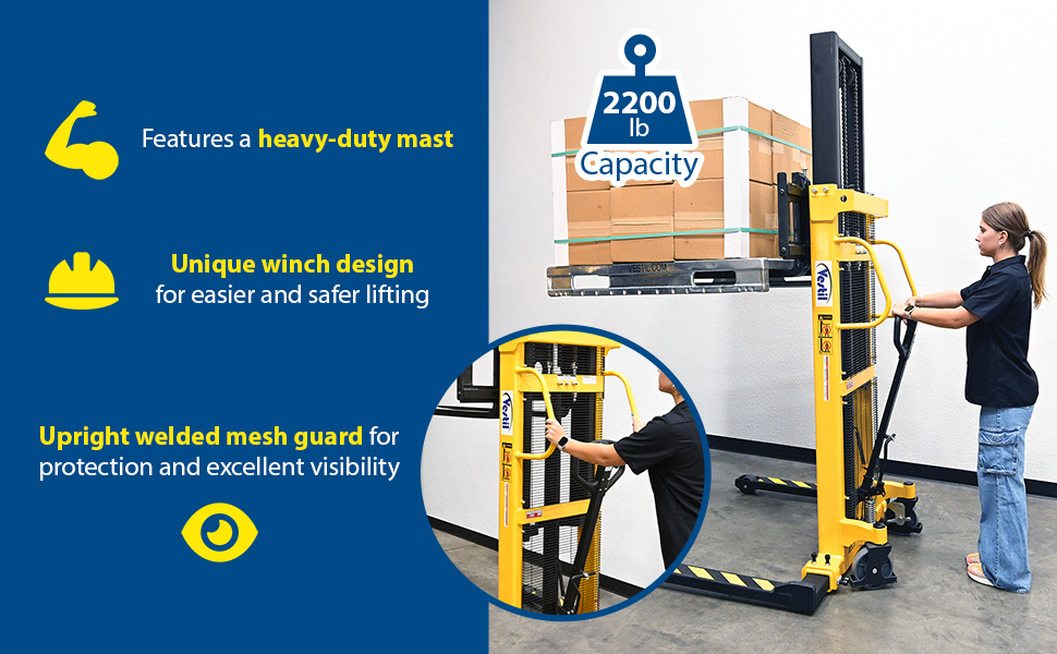 | Steel Stacker Manual Pump 2 - 118 In. 1,500 - 2,000 Lb. Capacity Black / Yellow | Capacity (lb.) at 0 - 62 (in.): 2,000 Capacity (lb.) at 62 - 118 (in.): 1,500 | 996 |