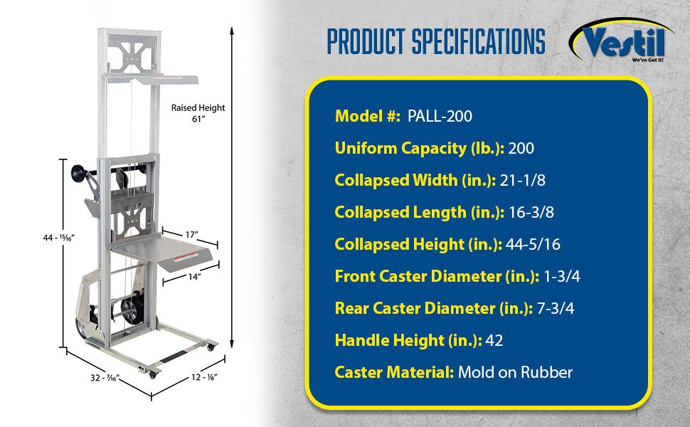 PALL-200 PALL-200Aluminum Portable Load Lifter 32-7/16 In. x 12-1/8 In. x 44-15/16 In. 200 Lb. Capacity SilverUniform Capacity (lb.): 200