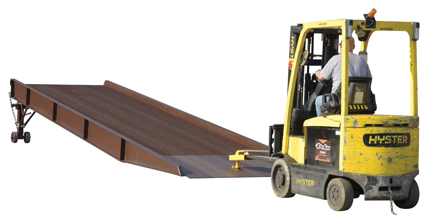 Steel Yard Ramps are designed to provide a safe and efficient way to quickly load and unload trucks, trailers and rail cars from ground level when no freight dock exists. Increase productivity while reducing material handling costs. Great for construction sites. A service range of 45" to 62". Available in 30 foot of straight ramp or 36 foot overall length; 30 foot of straight ramp and 6 foot level off. Standard features include: 8-5/8" steel wheels, positive traction open steel grating, safety locking chains, 4" high steel safety curbs, rubber bumpers, 13 7/8" usable lip support edge, tow bar pocket and welded steel construction. Painted neutral earth-tone brown. All units must ship flatbed truck. Steel Yard Ramps are essential for increasing productivity and reducing material handling costs, especially in construction sites and temporary loading areas.