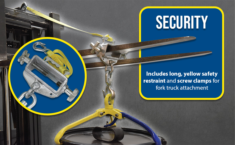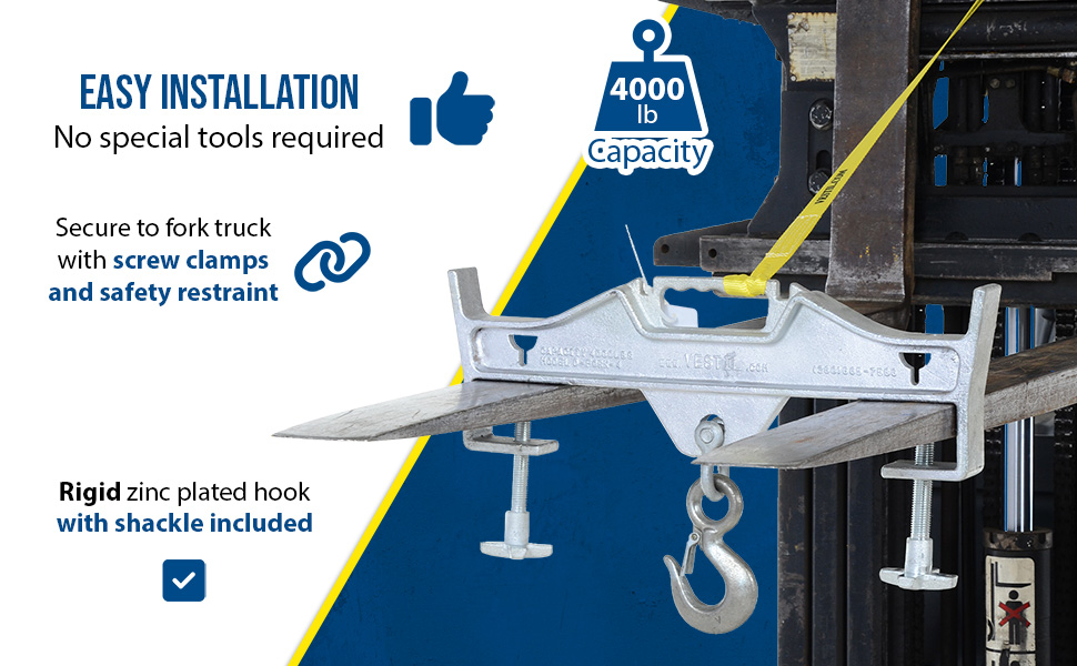 Convert your fork truck into a hook with anchor in a matter of seconds. The easy to attach Hoisting Hook does not require the assistance of special tools. Secured to the fork truck by means of a 48" long safety restraint and screw clamps. Available in single or double fork design. Units are zinc plated. Hook with shackle included. Model S-FORK-4-AT, Auto-Tension Hoisting Hook, offers a unique design and adds tension as weight is added, this unit has a yellow baked-in powder-coated toughness.