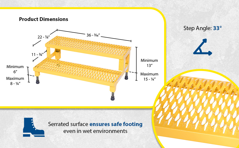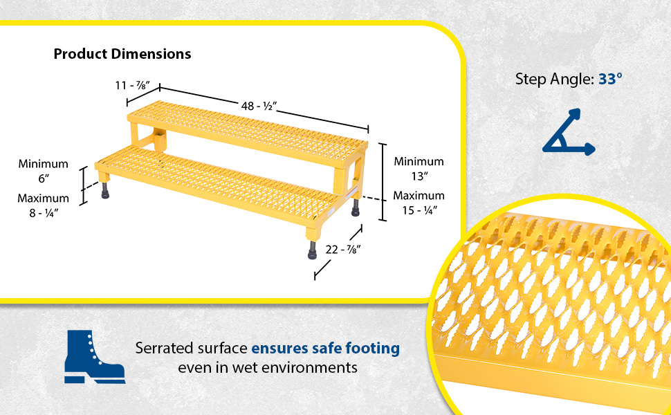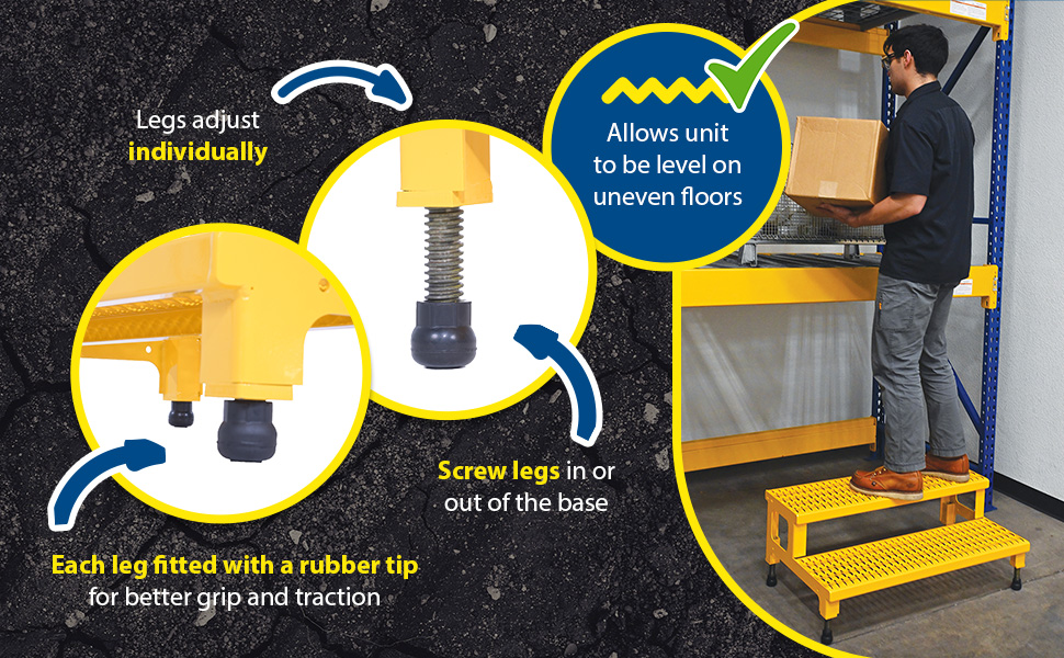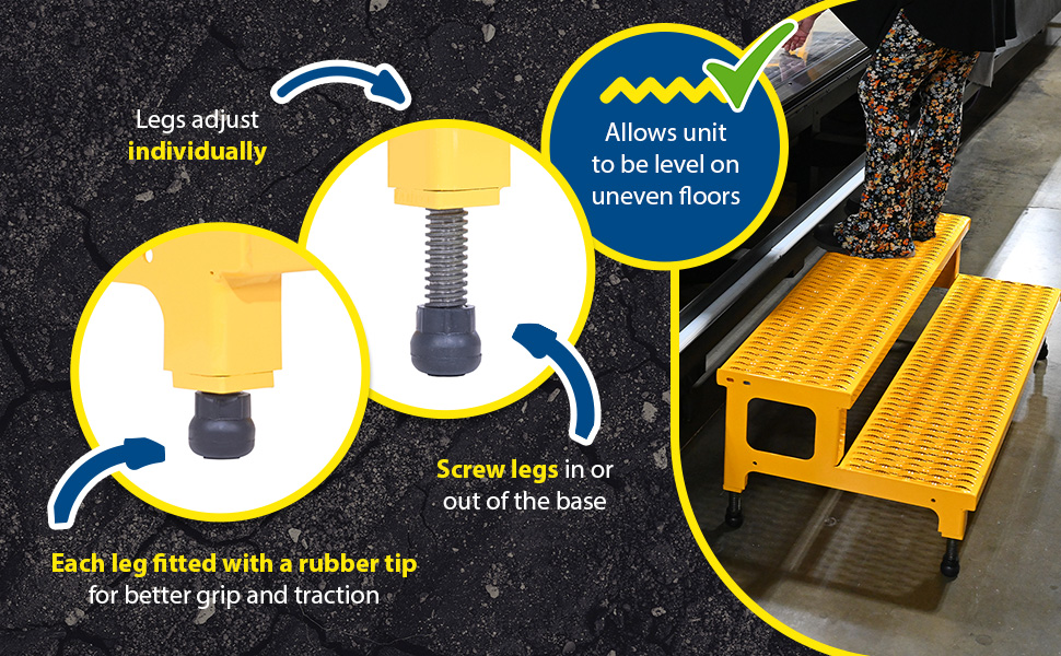 Our Adjustable Step-Mate Stands can be used as either a comfortable worker platform or a semipermanent step. Individual step size is 11-3/4" deep, aluminum construction 11-7/8" deep. Grip strut surface ensures safe footing. Legs adjust individually by screwing them into or out of the leg base. Welded construction. Uniform capacity 500 pounds. Steel units feature a yellow baked-in powder-coated toughness.