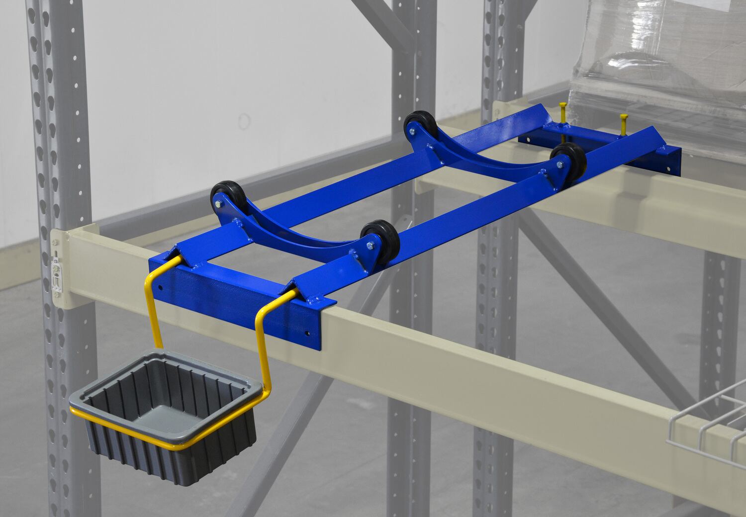 - Unique design converts standard pallet rack into a horizontal drum cradle
