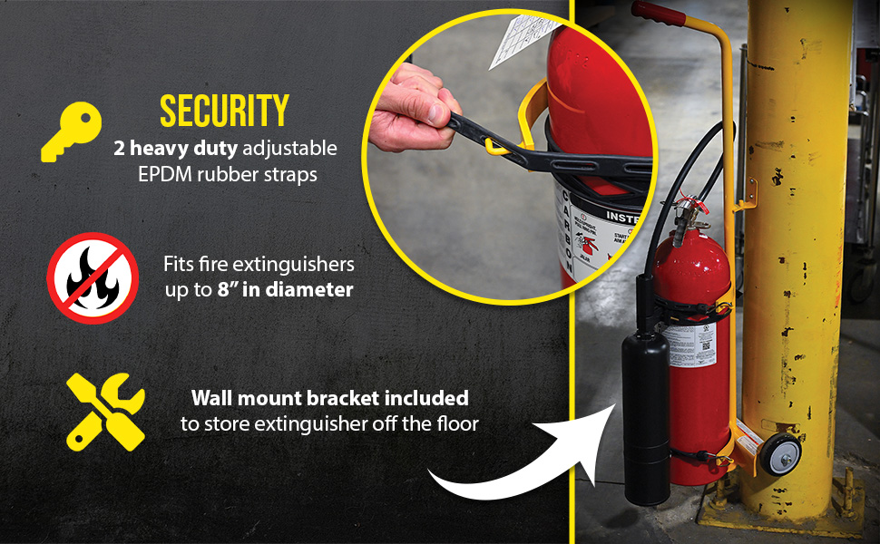 The Fire Extinguisher Carrier, model FEC-1, is designed for easily transporting your fire extinguisher up to 8" in diameter. Includes two (2) heavy duty adjustable rubber straps. Sturdy handle with rubber grip and poly casters for tilt-n-go portability. Welded steel construction with yellow baked-in powder-coat toughness. 4" x 2" stabilizing plate keeps unit upright when empty and helps retain extinguisher. Adjustable EPDM restraining straps keep extinguisher secure and allow for quick access. Wall mount bracket included to store the extinguisher off the floor.
