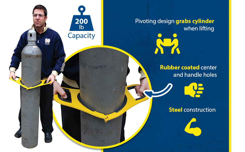 Manual Cylinder Lifters are easy to use and allow for safely lifting cylinders. The pivoting design grabs and squeezes the cylinder when lifted. Lifters feature a rubber-coated center and handle holes. Straight lift with one person or use for a 2 person team lift. Steel construction with a yellow baked-in powder coat finish for toughness. Uniform capacity is 200 pounds.