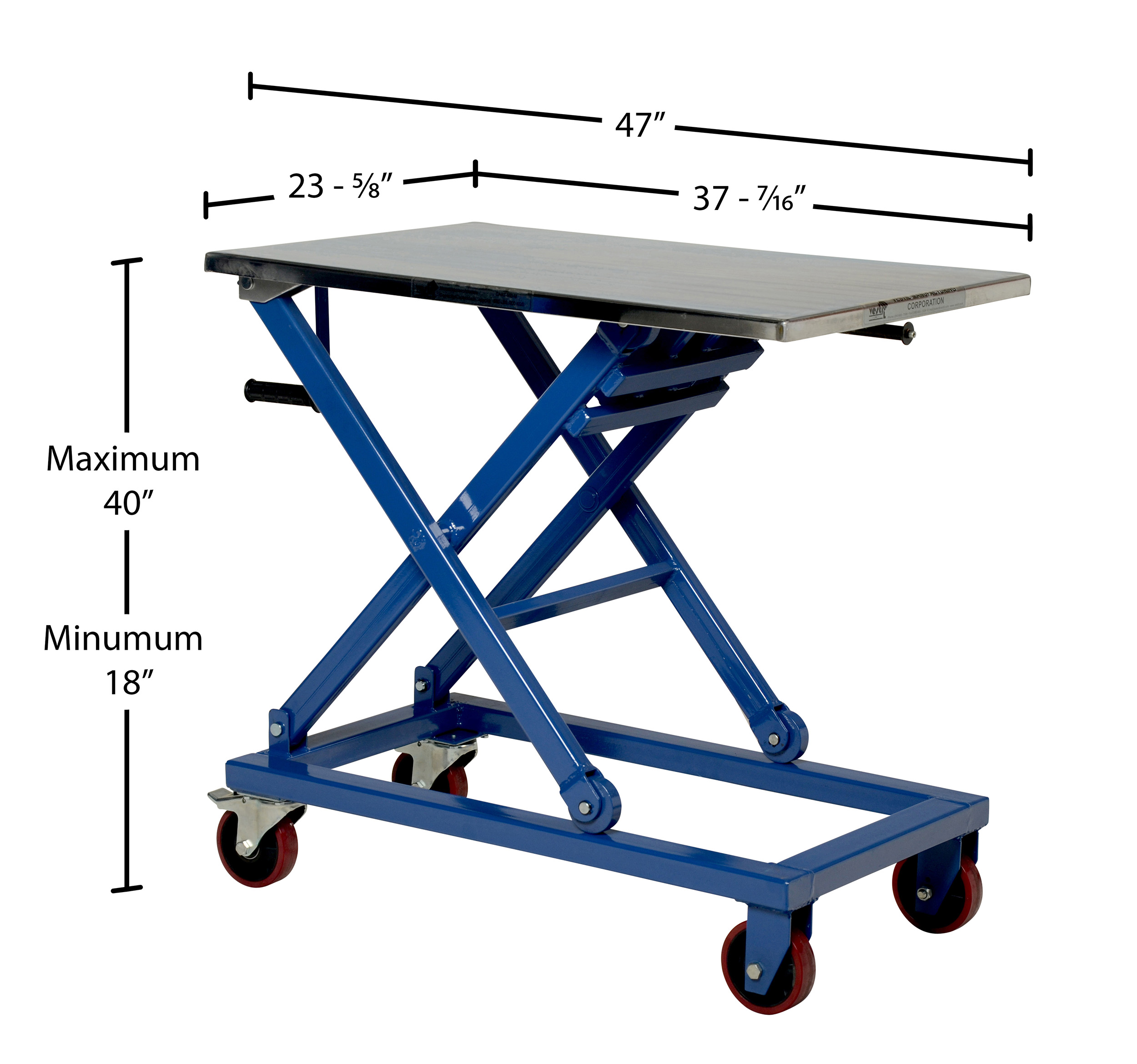 Steel Mechanical Scissor Cart 37 In. x 23-1/2 In. 660 Lb. Capacity Blue/SilverThe mechanical Scissor Cart raises and lowers material quickly and easily. The cart rolls smoothly on two rigid and two swivel casters. Mechanical screw drive provides precise positioning with no downward drift. Features an internal safety velocity fuse in each cylinder.
