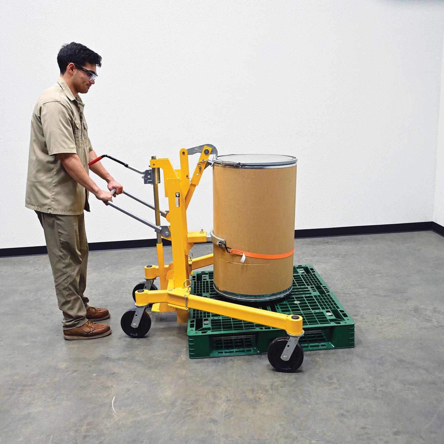 Steel Economical Ratchet Drum Transporter 55 Gallon 800 Lb. Capacity YellowUnique portable economical drum transporter is designed to lift and transport drums with a top lip. Steel jaw securely grips the top lip of the drum. Hand ratchet lift mechanism. Straddle legs rotate for access to drums on pallets. The push handle folds down for easy access to the ratchet.