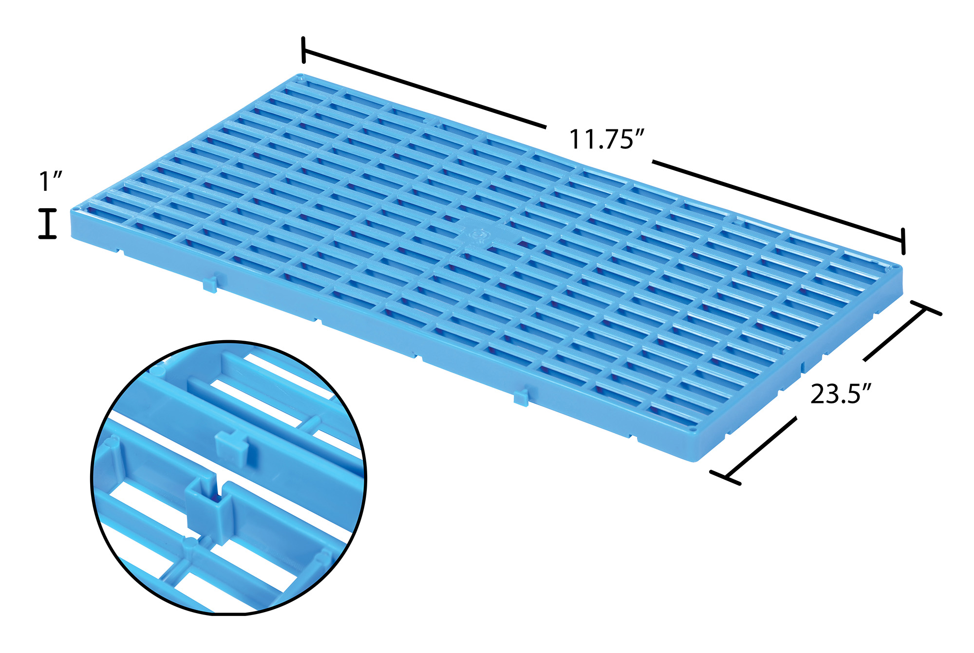 Polyethylene Floor Grid 15 Pack 1100 Lb. Capacity BlueThe plastic floor grid is ideal for storing product at an elevated height above cold and damp floors. Alternatively used as an ergonomic work surface to provide an anti-fatigue worker friendly environment. Snap together, abrasion, resistant "grid" sections are ideal for wet floors such as paint booths, car washes, or general work areas. The floor grids are lightweight, easy to attach with no hardware necessary.