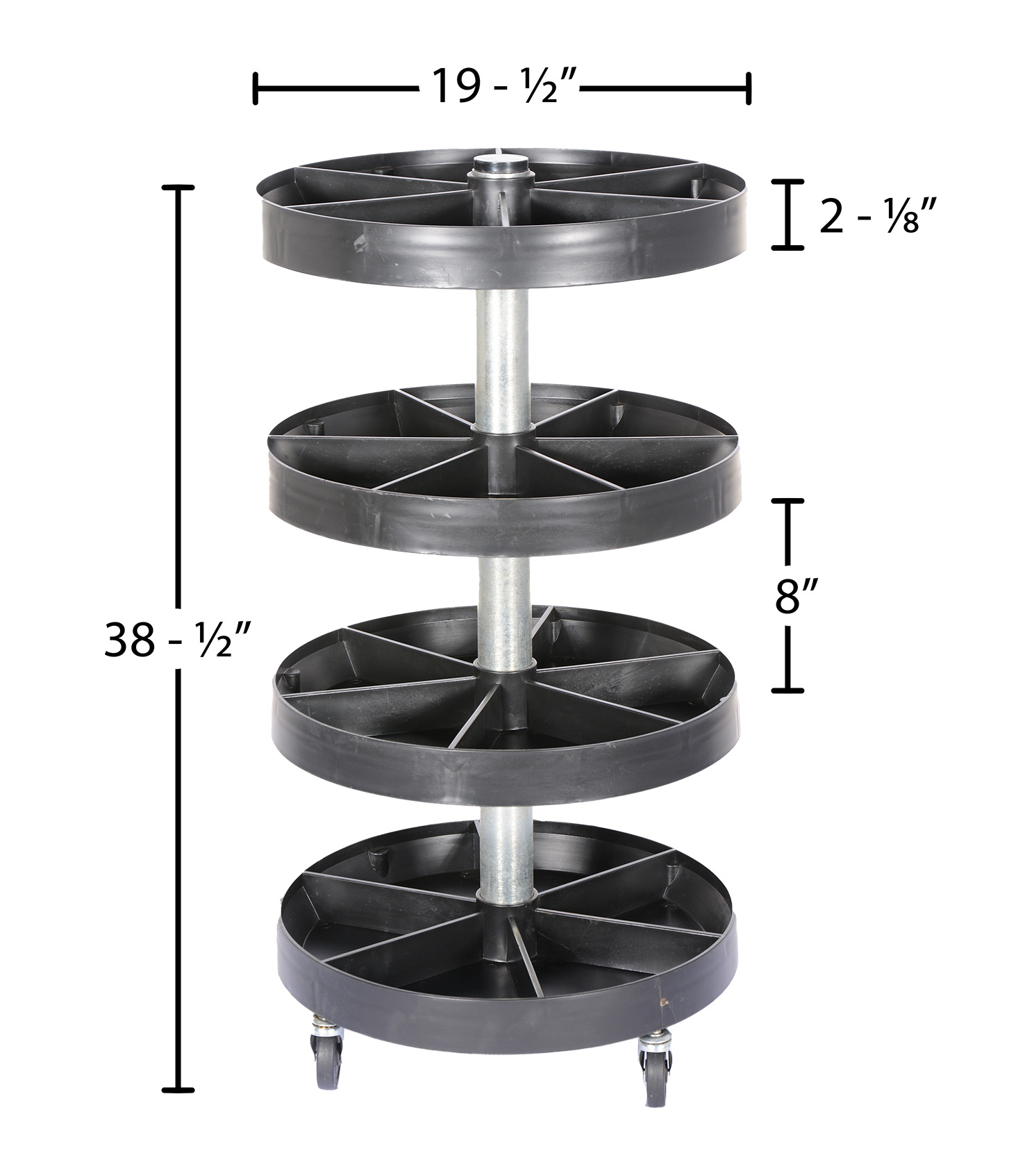 Cut parts picking time in half with this space saving, rotating portable parts bin. Compact enough to fit in small spaces such as corners and ends of aisles. Great for organization of small parts. Ideal for use in commercial and industrial applications.